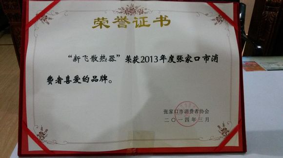 隨著新飛散熱器有限公司不斷發(fā)展與壯大,公司在央視廣告和各地不同形式廣告的大力投放,產(chǎn)品的不斷更新和質(zhì)量不斷提高,作為暖氣片十大品牌之一深受廣大消費者的喜愛和認(rèn)可。特別是張家口市,3.15消費者協(xié)會在張家口市調(diào)查、評選,我們榮獲張家口市消費者喜愛和放心品牌。我們會秉承公司的理念,不斷向前飛躍,來回報廣大消費者。